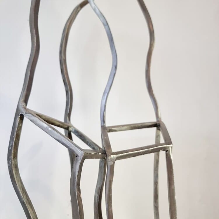 Emad Dhahir combines technical control and artistic vision to capture the human form in steel. The main sources if inspiration for my body of sculptural work comes from the mythology of my own culture.-the ancient Mesopotamia which are blended with rituals of my daily life, my dreams and memories. I borrow the beauty from formal and aesthetic qualities of old ancient sculptures as well as the languages and forms of of modern sculpture such as those of Giacometti, transforming them into a new contemporary language,and spicing them with an Iraqi style. Inspired and influenced by Spanish sculptors Manuel Marti Moreno and Juame Plensa who utilise steel nuts and iron in their large scale works.