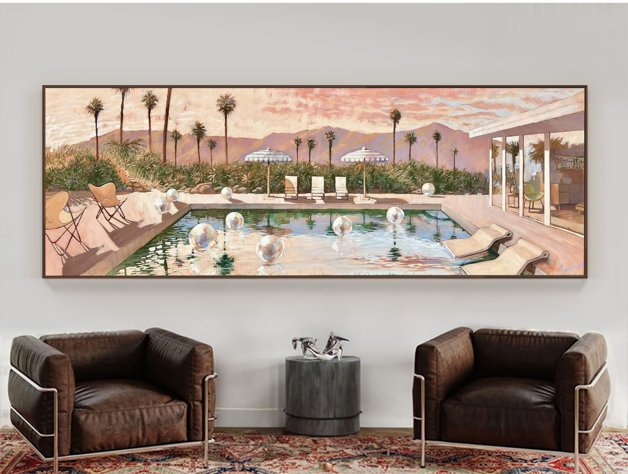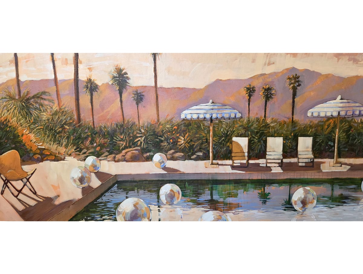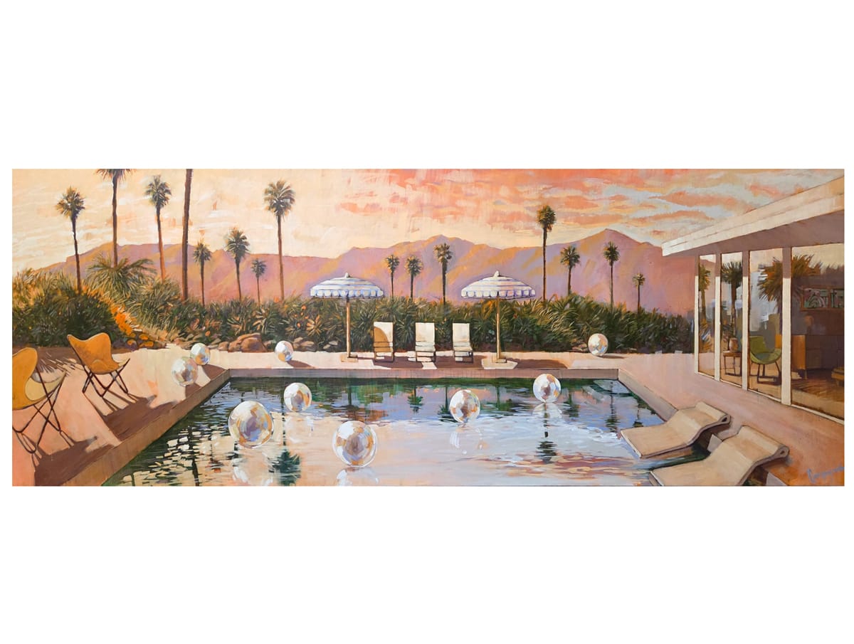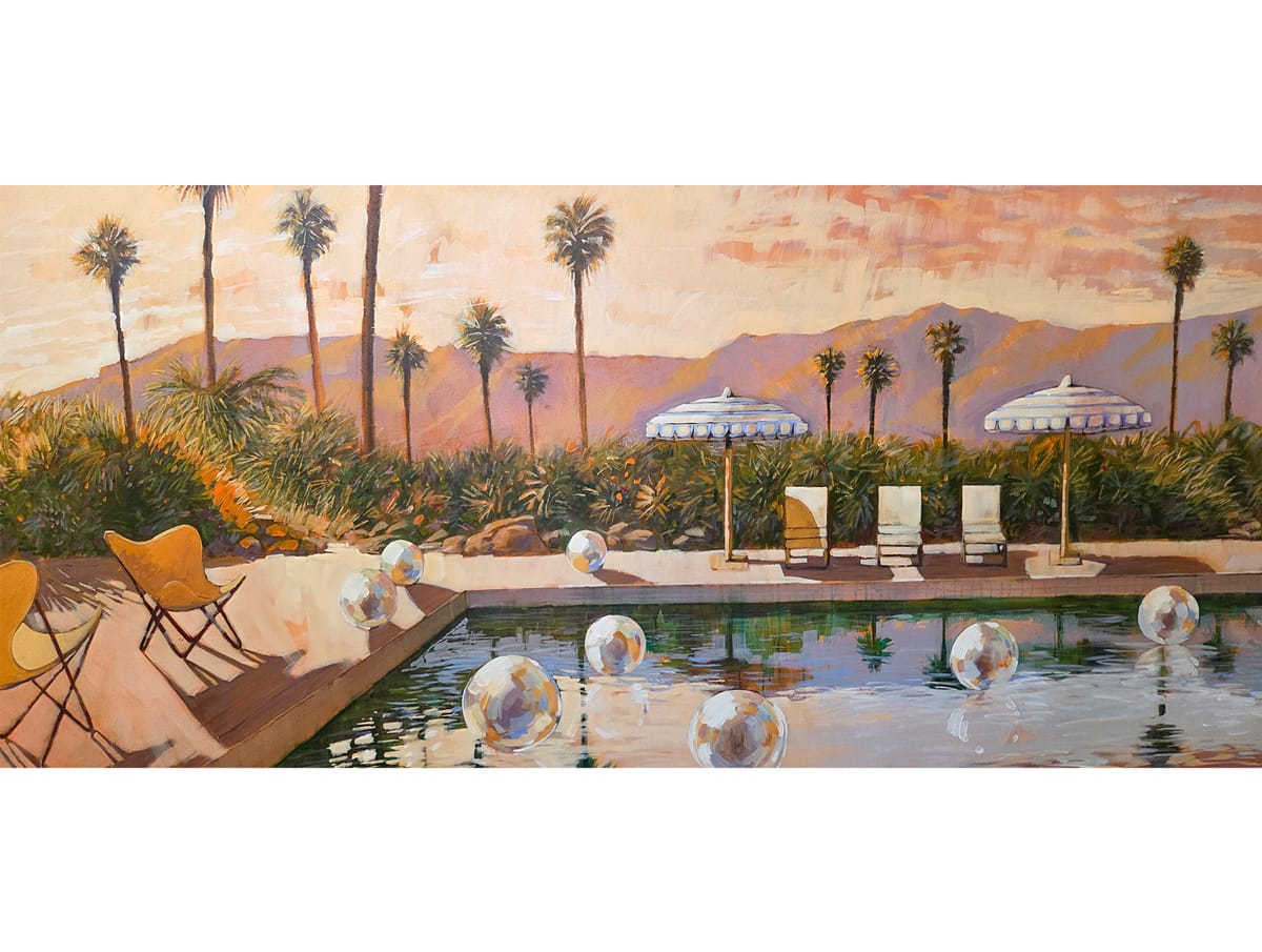 His years in graphic art and fashion show. Edges are clean, shadows read as flat shapes, compositions have a designer’s eye for structure. It could easily tip into something slick or digital. The paint itself resists that. The weight of it, the visible drag of each stroke, keeps the work rooted in something made by hand.