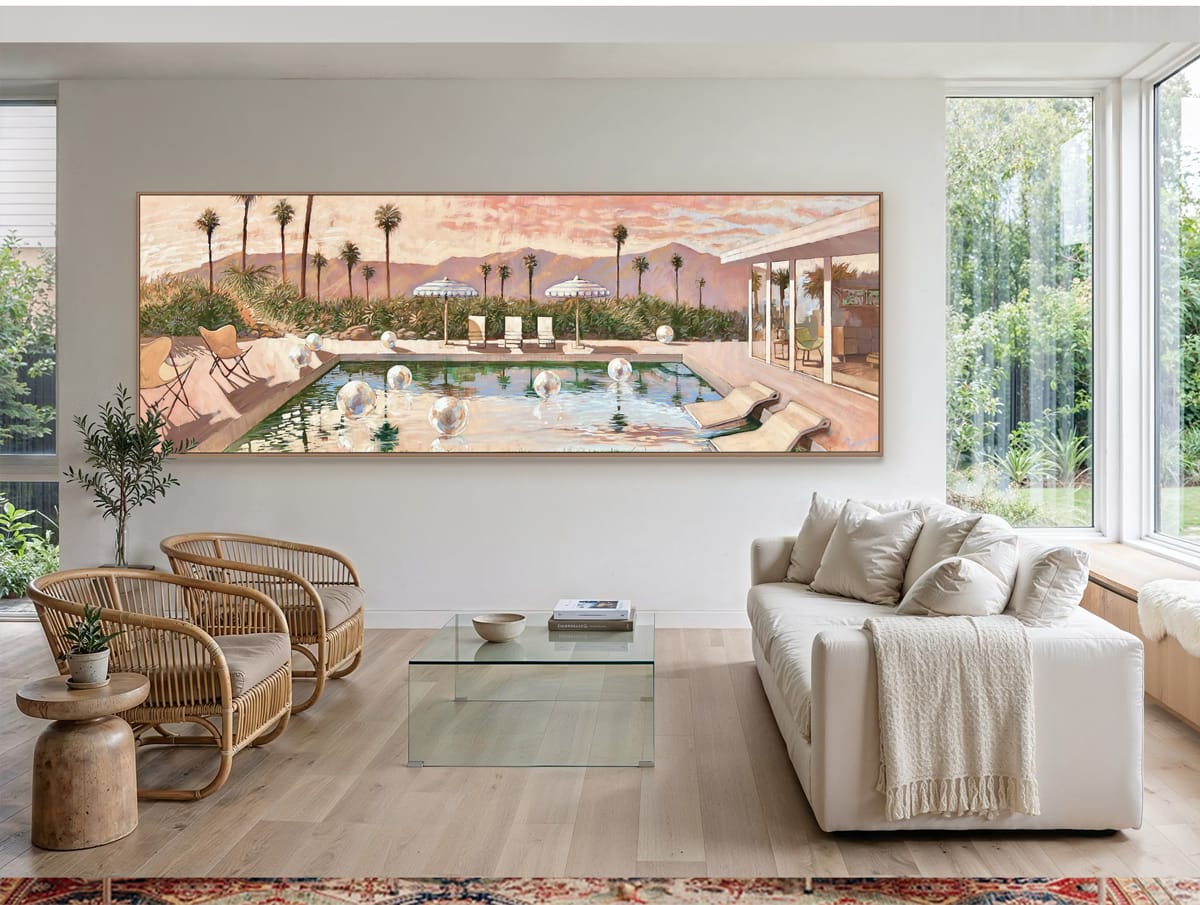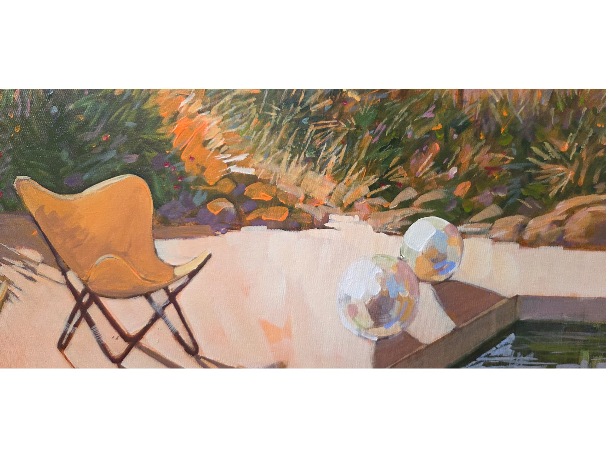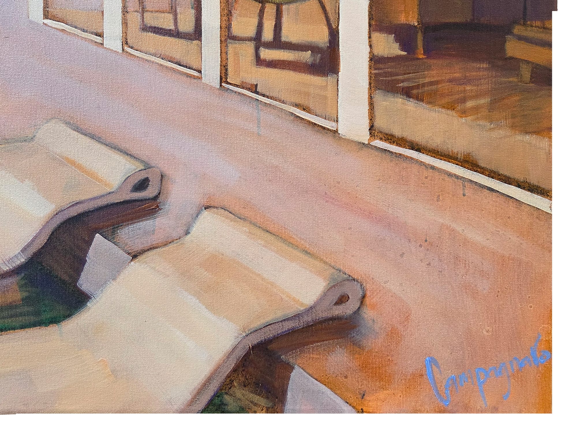 Campagnaro works with thick, unhurried brushstrokes and a palette kept deliberately soft. The restraint is intentional: most of the canvas breathes, so when detail appears, it lands.