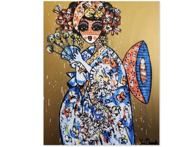 His still life, portraits and seductive figures form a cohesive body of work. His technique is spontaneous and physical with his use of layers and colours to create the loose lines in his figures. The women and Geishas are imaginary, soft and elegant with exaggerated eyes, expressing their strength, and inviting the viewer to bring their own interpretation to his works.