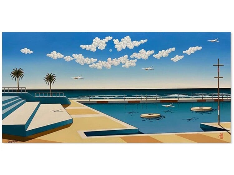 “My fascination with Australia’s Eastern Seaboard and its iconic architectural beauty springs from my teenage years living in Sydney’s North and being an avid surfer and later, extensively travelling the East Coast playing in rock and roll bands. The Art Deco Bathing Pavilions, Surf Clubs and Ocean Baths have been a constant motif and preoccupation in my work. My sharply defined style aims to not only capture something about the Australian experience of landscape – how we impose ourselves upon it, how we exist in it, but to also explore how our intense antipodean light illuminates and dominates that whole experience”