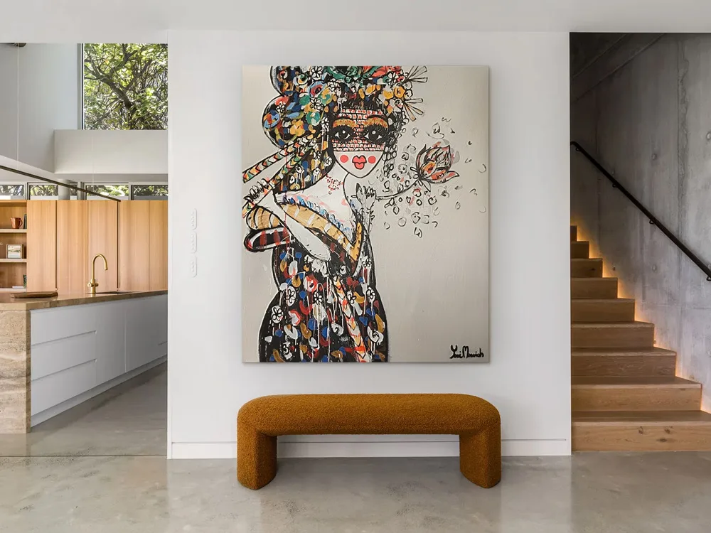 His work is characterised by a love of mark-making, a bold and exuberant colour palette, a vibrant collection of characters and a maelstrom of emotions. Fast and free, his bold colour combinations are an exciting visual experience. His technique of laying down colour and intricate brush strokes in sections, gives a unique sense of depth and movement to his work, bringing the paintings to life.
