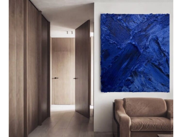 “My works are immersive and textural made from a blend of concrete and polymer, or gels on canvas, using a mass of product, capturing the essence of the creative process. They are intense and raw, with a gestural abstraction. Normally In visceral colours.